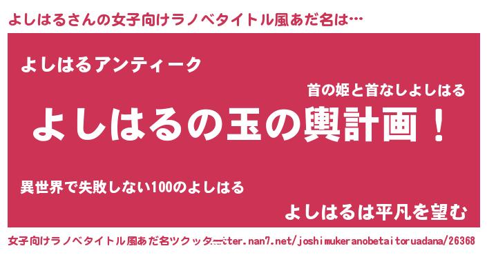 | 男性向けラノベタイトル風あだ名 | 『よしはる~年齢イコール彼女いない歴の魔法使い~』 |