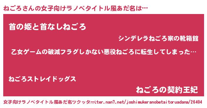 | 男性向けラノベタイトル風あだ名 | 『この素晴らしい世界にねごろを!』 |