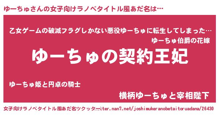 | 男性向けラノベタイトル風あだ名 | 『ゆーちゅという概念が存在しない退屈な世界 』 |