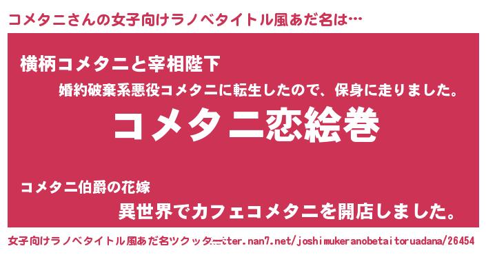コメタニさんの女子向けラノベタイトル風あだ名は… 『コメタニ恋絵巻』『横柄コメタニと宰相陛下』『異世界でカフェコメタニを開店しました。』 ツクッター #女子向けラノベタイトル風あだ名ツクッター http://tkutter.nan7.net/joshimukeranobetaitoruadana/26454/