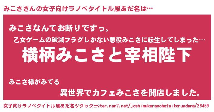 | 男性向けラノベタイトル風あだ名 | 『みこさに滅ぼされるだけの簡単なお仕事です』 |