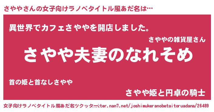 | 男性向けラノベタイトル風あだ名 | 『おまえをオタクにしてやるから、俺をさややにしてくれ! 』 |