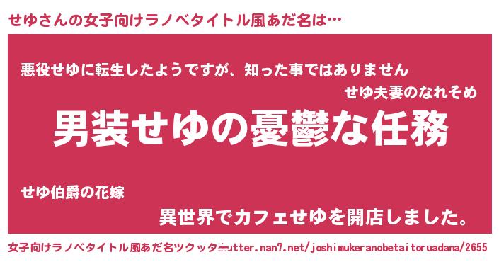| 男性向けラノベタイトル風あだ名 | 『うちのせゆが世界を掌握している!』 |