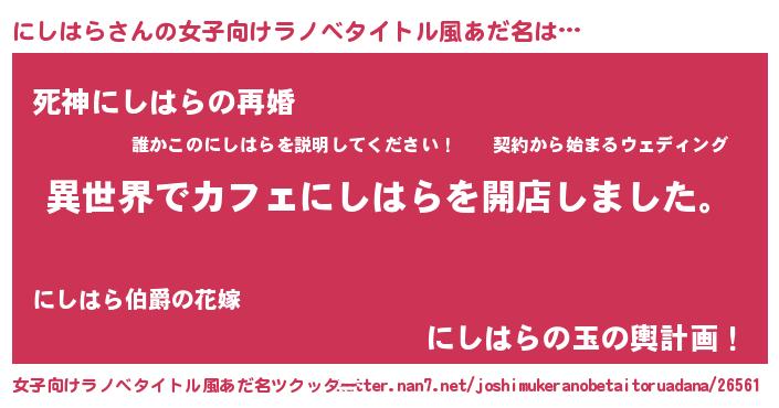 | 男性向けラノベタイトル風あだ名 | 『誰もが恐れるあのにしはらが、ぼくの専属メイドになるようです。』 |
