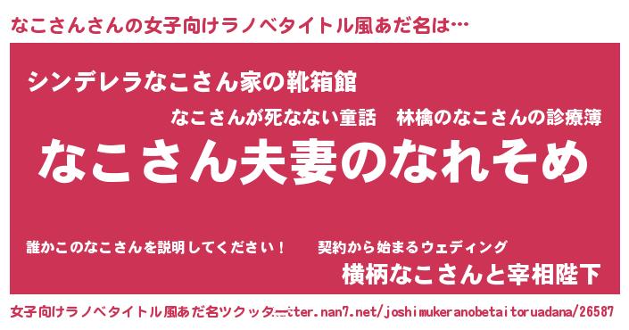 | 男性向けラノベタイトル風あだ名 | 『おまえをオタクにしてやるから、俺をなこさんにしてくれ! 』 |