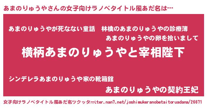 | 男性向けラノベタイトル風あだ名 | 『あまのりゅうやに滅ぼされるだけの簡単なお仕事です』 |