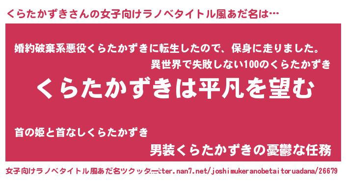| 胡散臭い通販商品みたいなあだ名 | 『信頼と実績のペンダント…その名も「くらたかずき」』 |