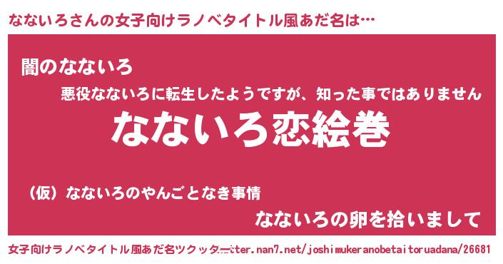 | 男性向けラノベタイトル風あだ名 | 『おまえをオタクにしてやるから、俺をなないろにしてくれ! 』 |