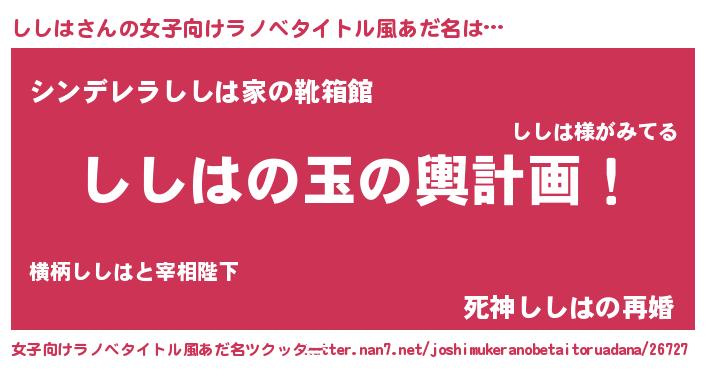 男性向けラノベタイトル風あだ名 | 『ししは~年齢イコール彼女いない歴の魔法使い~』 |
