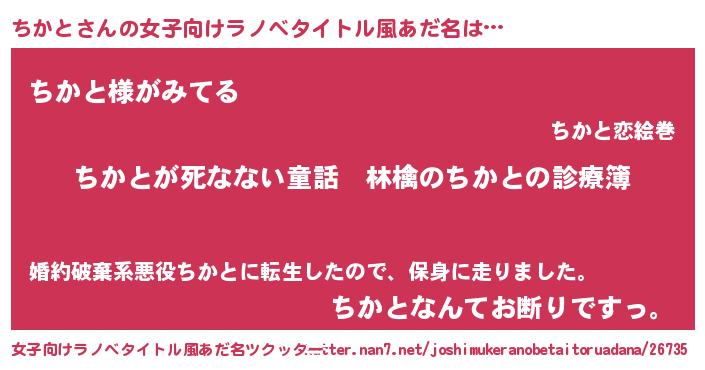 | 男性向けラノベタイトル風あだ名 | 『魔弾の王とちかと』『チカトスレイヤー』 |