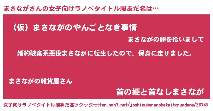 まさながさんの女子向けラノベタイトル風あだ名は… 『婚約破棄系悪役まさながに転生したので、保身に走りました。』『(仮)まさながのやんごとなき事情』『首の姫と首なしまさなが』 ツクッター #女子向けラノベタイトル風あだ名ツクッター http://tkutter.nan7.net/joshimukeranobetaitoruadana/26749/
