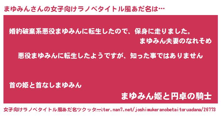 | 男性向けラノベタイトル風あだ名 | 『この素晴らしい世界にまゆみんを!』 |
