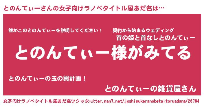 | 男性向けラノベタイトル風あだ名 | 『とのんてぃーの嫁は女の子じゃないと思った?』 |