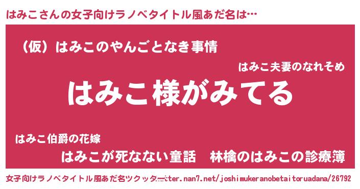 | 男性向けラノベタイトル風あだ名 | 『はみこの嫁は女の子じゃないと思った?』 |