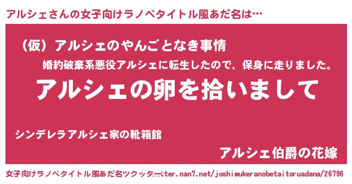 | 男性向けラノベタイトル風あだ名 | 『アルシェの嫁は女の子じゃないと思った?』 |