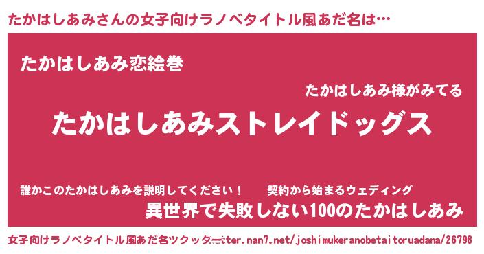 | 男性向けラノベタイトル風あだ名 | 『Re:たかはしあみから始める異世界生活』 |