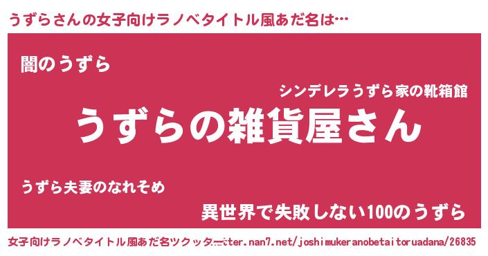 うずらさんの女子向けラノベタイトル風あだ名は… 『うずらの雑貨屋さん』『闇のうずら』『異世界で失敗しない100のうずら』 ツクッター #女子向けラノベタイトル風あだ名ツクッター http://tkutter.nan7.net/joshimukeranobetaitoruadana/26835/
