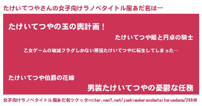 | 男性向けラノベタイトル風あだ名 | 『この素晴らしい世界にたけいてつやを!』 |