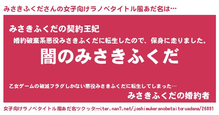 | 男性向けラノベタイトル風あだ名 | 『Re:みさきふくだから始める異世界生活』 |