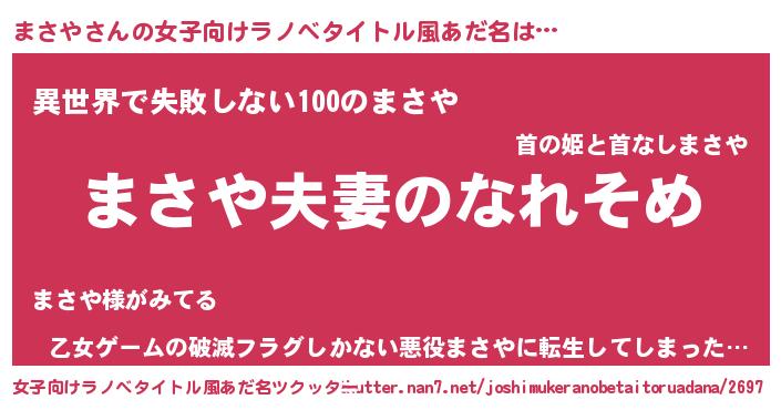 | 男性向けラノベタイトル風あだ名 | 『おまえをオタクにしてやるから、俺をまさやにしてくれ! 』 |