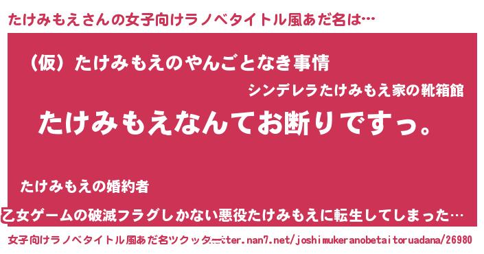 | 肩書あだ名 | 『たけみもえ総統』『たけみもえ御曹司』 |