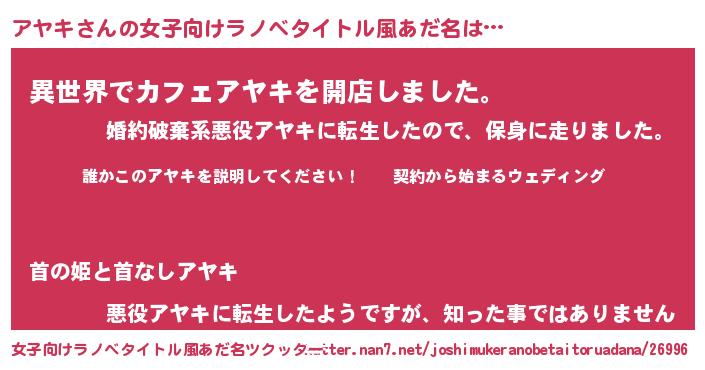 | 男性向けラノベタイトル風あだ名 | 『アヤキアートオンライン』 |