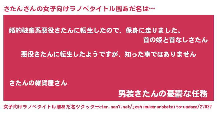 | 男性向けラノベタイトル風あだ名 | 『この素晴らしい世界にさたんを!』 |