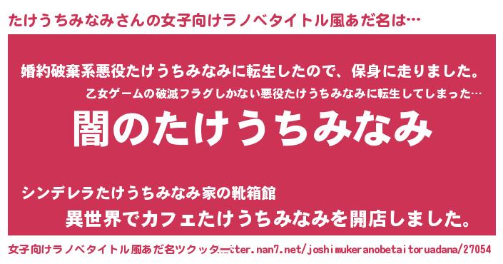 | 男性向けラノベタイトル風あだ名 | 『Re:たけうちみなみから始める異世界生活』 |