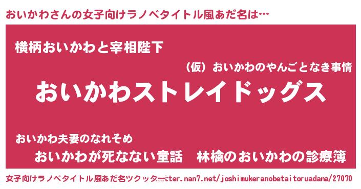 | 男性向けラノベタイトル風あだ名 | 『Re:おいかわから始める異世界生活』 |