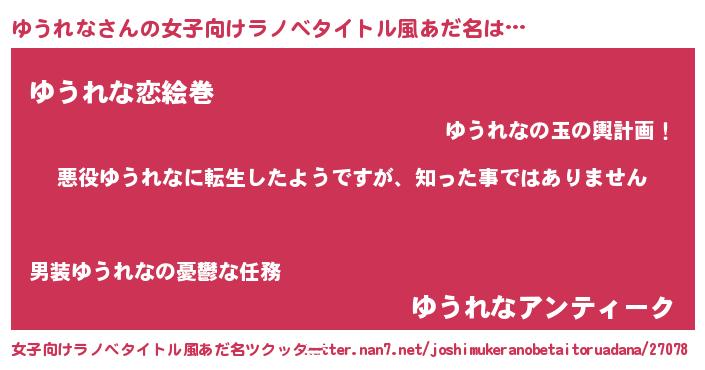 ゆうれなさんの女子向けラノベタイトル風あだ名は… 『悪役ゆうれなに転生したようですが、知った事ではありません』『ゆうれな恋絵巻』『ゆうれなアンティーク』 ツクッター #女子向けラノベタイトル風あだ名ツクッター http://tkutter.nan7.net/joshimukeranobetaitoruadana/27078/