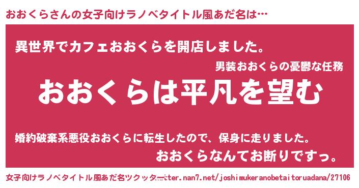 | 男性向けラノベタイトル風あだ名 | 『ダンジョンにおおくらを求めるのは間違っているだろうか』 |