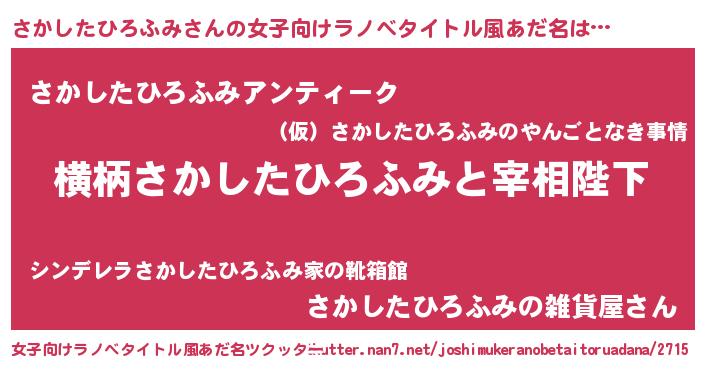 | 男性向けラノベタイトル風あだ名 | 『さかしたひろふみに滅ぼされるだけの簡単なお仕事です』 |