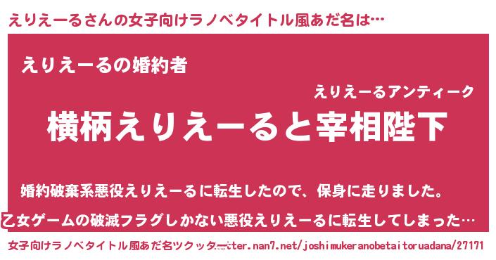 | 男性向けラノベタイトル風あだ名 | 『えりえーるに滅ぼされるだけの簡単なお仕事です』 |