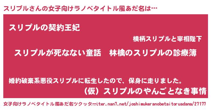 | 男性向けラノベタイトル風あだ名 | 『魔弾の王とスリプル』『スリプルの憂鬱』 |