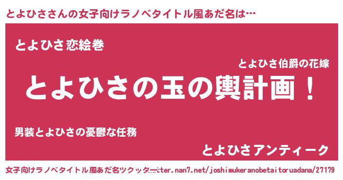 | 男性向けラノベタイトル風あだ名 | 『とよひさ~年齢イコール彼女いない歴の魔法使い~』 |