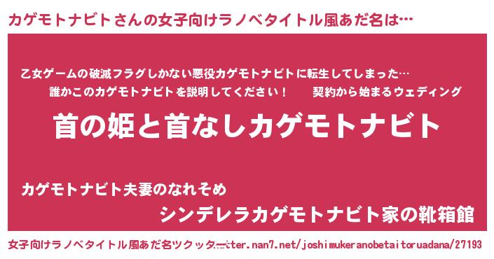 | 胡散臭い通販商品みたいなあだ名 | 『世界中を虜にした100年もののヴィンテージワイン…その名も「カゲモトナビト」』 |