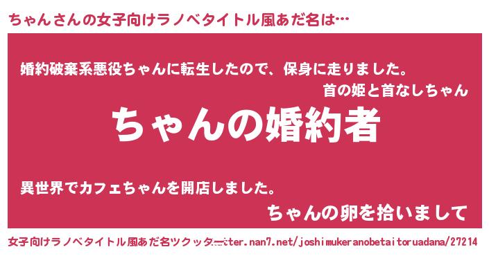 | 男性向けラノベタイトル風あだ名 | 『うちの娘の為ならば、俺はもしかしたらちゃんも倒せるかもしれない。』 |