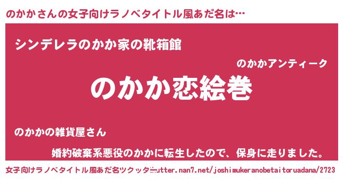 | 男性向けラノベタイトル風あだ名 | 『おまえをオタクにしてやるから、俺をのかかにしてくれ! 』 |