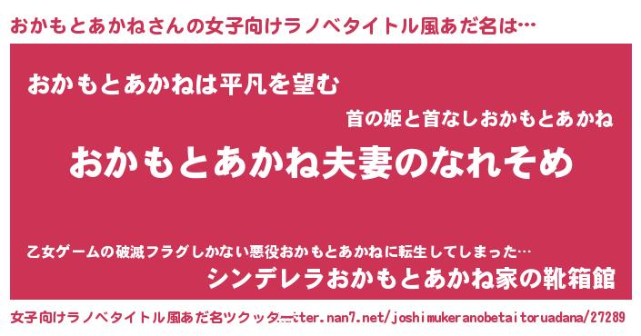 おかもとあかねさんの女子向けラノベタイトル風あだ名は… 『おかもとあかね夫妻のなれそめ』『おかもとあかねは平凡を望む』『シンデレラおかもとあかね家の靴箱館』 ツクッター #女子向けラノベタイトル風あだ名ツクッター http://tkutter.nan7.net/joshimukeranobetaitoruadana/27289/