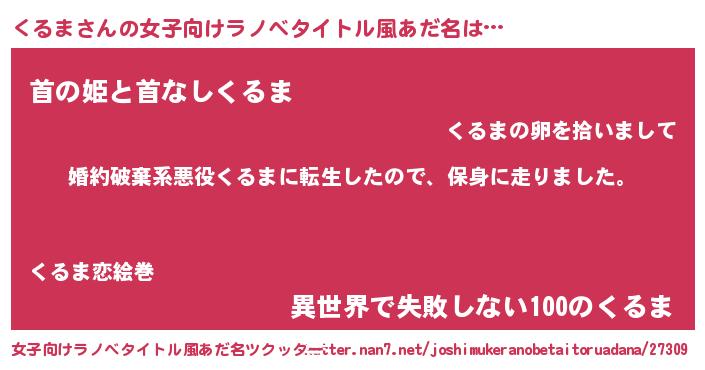 | 男性向けラノベタイトル風あだ名 | 『転生したらくるまだった件』 |