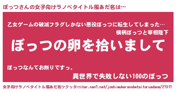 | 男性向けラノベタイトル風あだ名 | 『ダンジョンにぼっつを求めるのは間違っているだろうか』 |