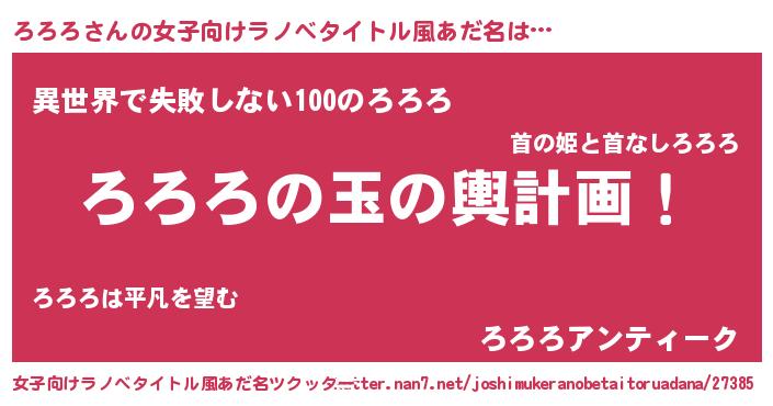 | 男性向けラノベタイトル風あだ名 | 『ろろろ~年齢イコール彼女いない歴の魔法使い~』 |