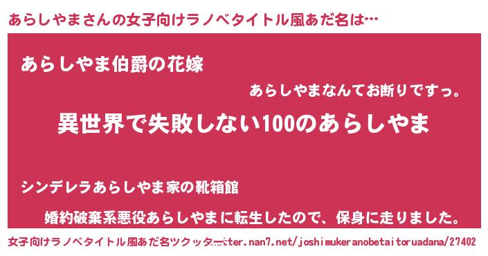 | 男性向けラノベタイトル風あだ名 | 『あらしやまという概念が存在しない退屈な世界 』 |