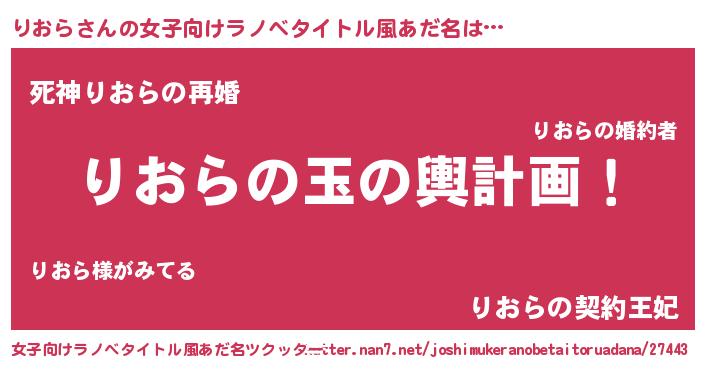 りおらさんの女子向けラノベタイトル風あだ名は… 『りおらの玉の輿計画!』『死神りおらの再婚』『りおらの契約王妃』 ツクッター #女子向けラノベタイトル風あだ名ツクッター http://tkutter.nan7.net/joshimukeranobetaitoruadana/27443/