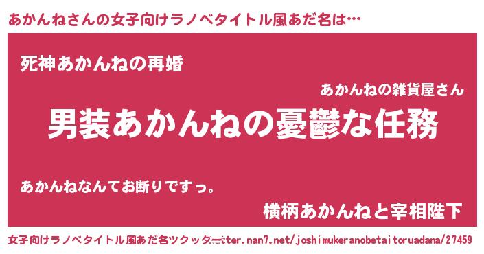 あかんねさんの女子向けラノベタイトル風あだ名は… 『男装あかんねの憂鬱な任務』『死神あかんねの再婚』『横柄あかんねと宰相陛下』 ツクッター #女子向けラノベタイトル風あだ名ツクッター http://tkutter.nan7.net/joshimukeranobetaitoruadana/27459/
