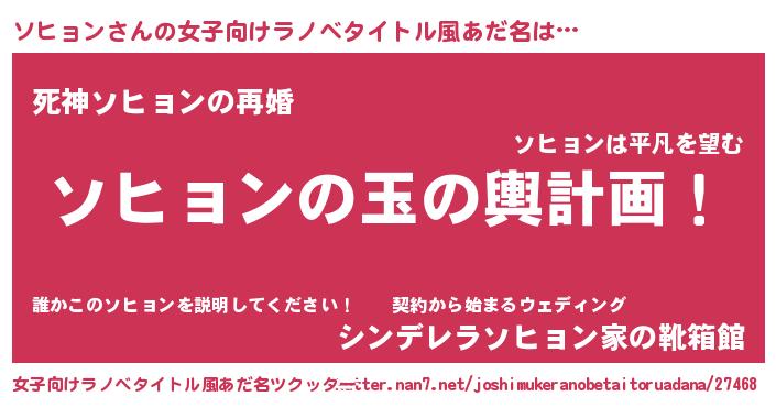 | 男性向けラノベタイトル風あだ名 | 『ソヒョン~年齢イコール彼女いない歴の魔法使い~』 |