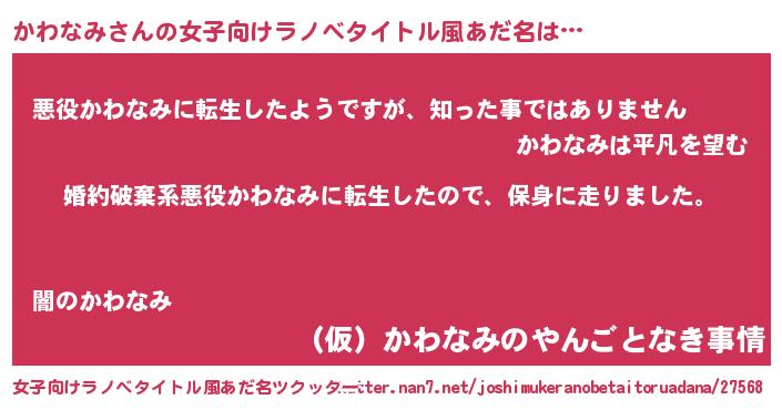 | 男性向けラノベタイトル風あだ名 | 『カワナミスレイヤー』『かわなみの憂鬱』 |