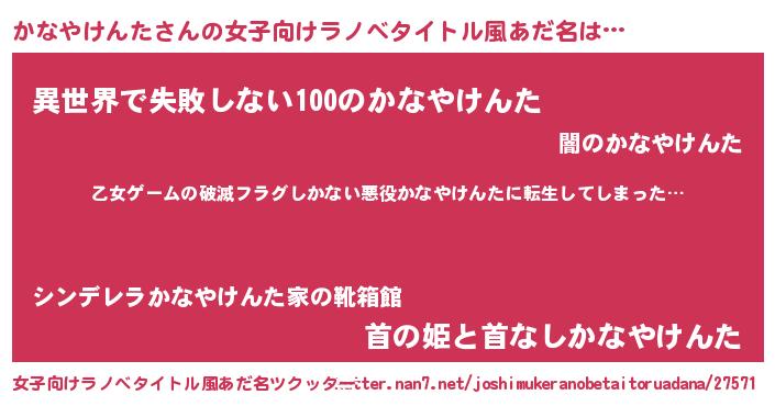 | 男性向けラノベタイトル風あだ名 | 『魔弾の王とかなやけんた』 |