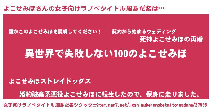 | 胡散臭い通販商品みたいなあだ名 | 『絶対に幸福をもたらす水素水…その名も「よこせみほ」』 |