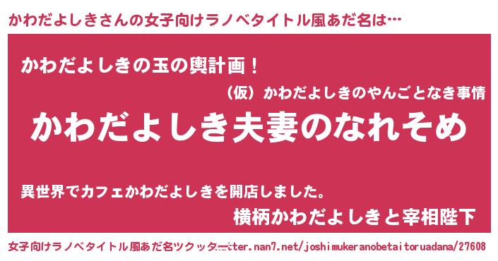 | 男性向けラノベタイトル風あだ名 | 『おまえをオタクにしてやるから、俺をかわだよしきにしてくれ! 』 |